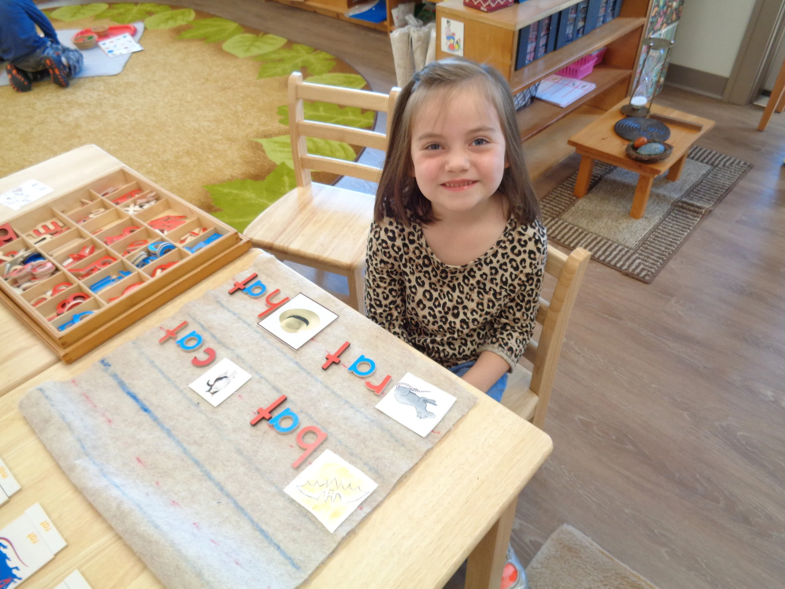 This is an extremely important time for language development. Phonetic sounds are learned through fun activities like the "I Spy Game" and sandpaper letters, leading to word formation with the moveable alphabet and later to writing. Reading takes place first by matching picture cards to words. Early readers are introduced when the children are ready for them.