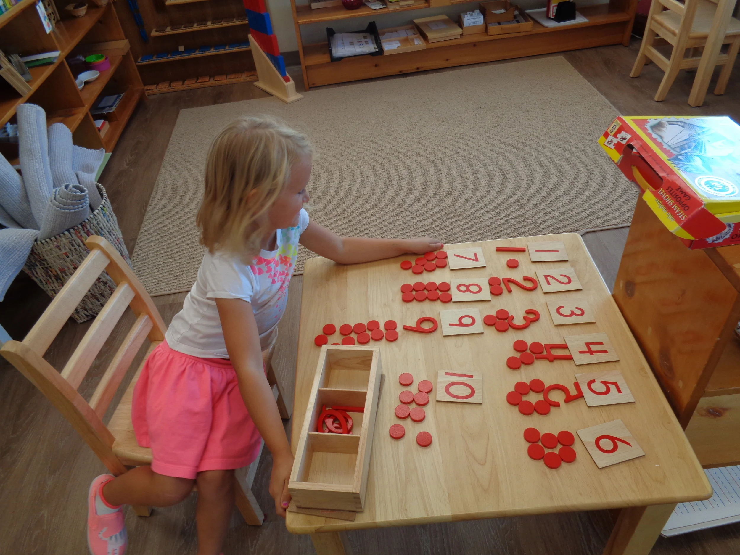 Hands-on materials, such as the red and blue rods, bead bars, chains and cubes help the child to grow from concrete to abstract math concepts. Children are able to benefit from the math materials even before they learn to write numbers. Learning mathematics at this age is not repetitive rote learning. Children love to learn the quantities and symbols for numbers even into the thousands. Names of geometric shapes and solids roll off the tongues of three and four year olds, while others begin learning addition, subtraction, multiplication, division and fractions.